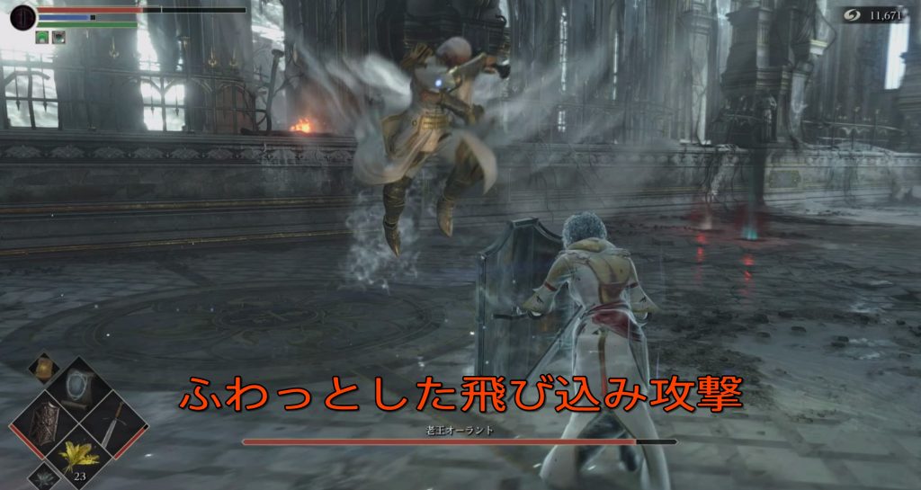 フワッと浮いたかと思うと、ストーンと斬りこみ攻撃がきます。 オーラントの攻撃は基本的に横回避することで対応可能ですが、青く発光する掴み攻撃だけは後方回避で対処します。