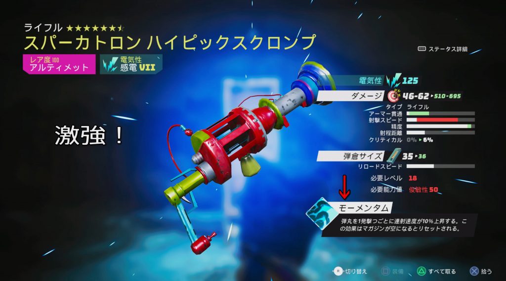 コイツを握ったその日から、ゴリ押し戦法で勝利するケースが増えました😅 本来、戦闘を楽しむなら近接攻撃と遠距離攻撃を組み立てて、ハラハラドキドキのスタイリッシュプレイで敵をやっつけるのが、気持ちいいんですけどね・・・💦
