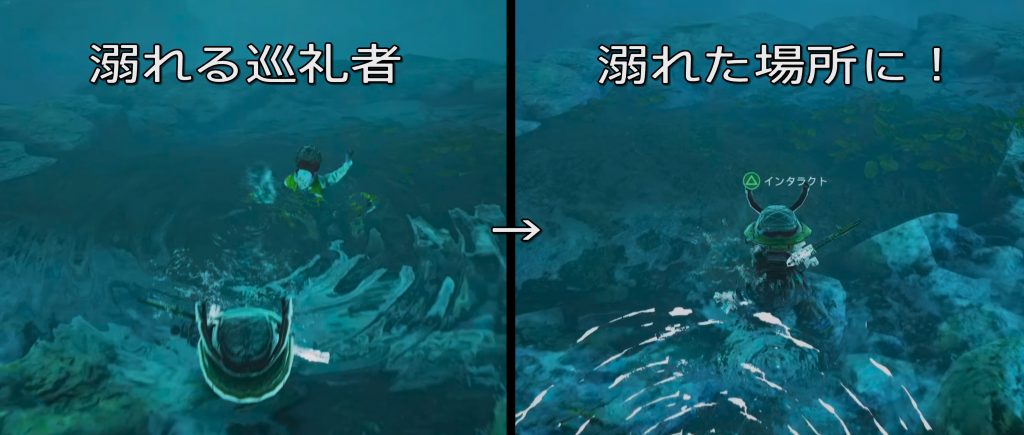 この時、溺れる行く末を見守りつつ自分も同時に溺れるケースに注意して下さい。 巡礼者が溺れ出したら、ジャンプや移動で自分は岸の上へと移動しましょう!